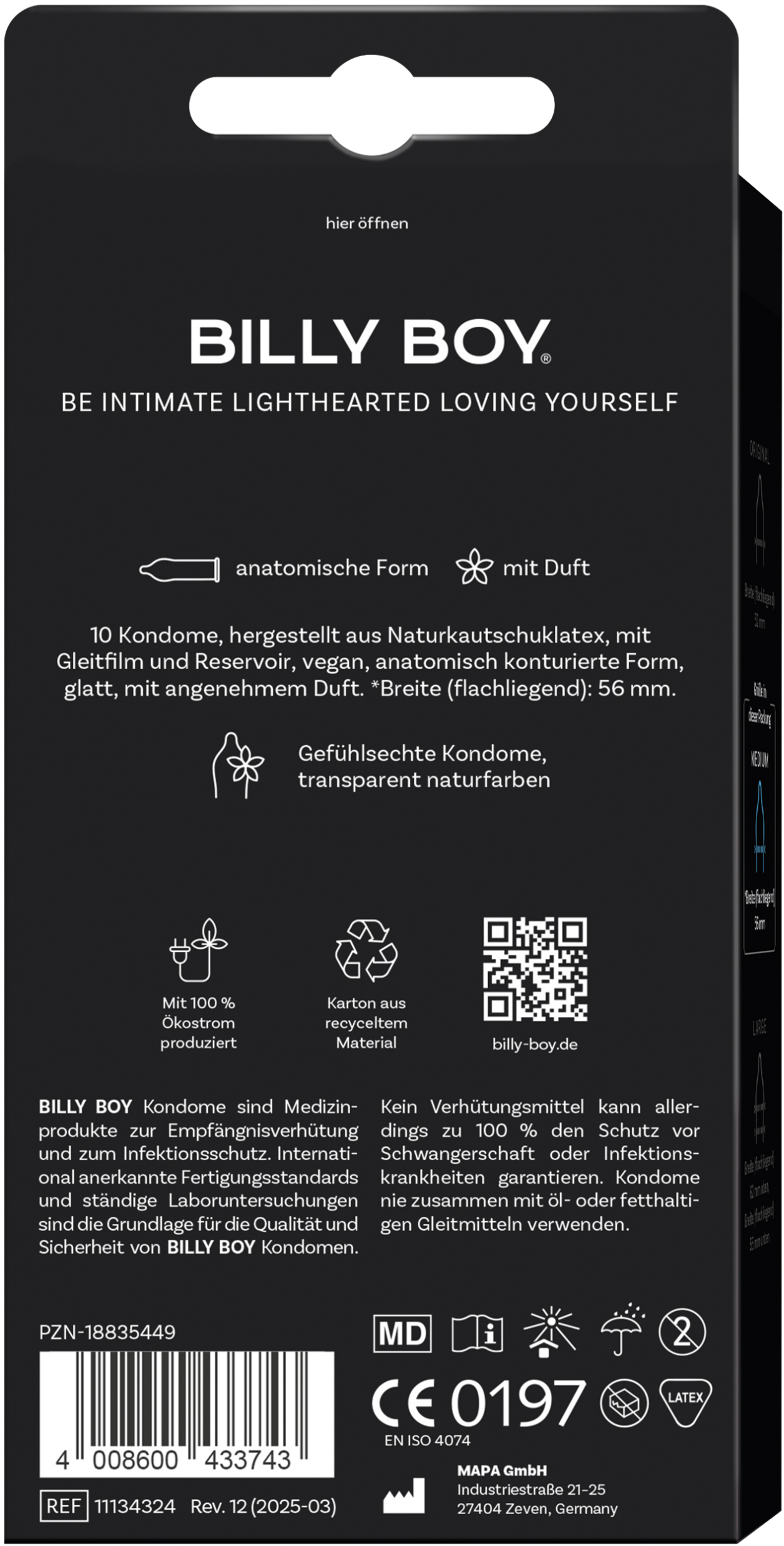Kondome sind grundsätzlich vorsichtig zu behandeln. Beachten Sie bitte das auf der Verpackung und den Siegelbriefchen angegebene Haltbarkeitsdatum – nach Ablauf sollte das Kondom nicht mehr verwendet werden! Kondome kühl, trocken und vor Hitze und direkter Sonneneinstrahlung geschützt lagern. Kondome greifen nicht in den Organismus ein und erzeugen keine Nebenwirkungen. Dennoch können Unverträglichkeiten in Form allergischer Reaktionen (z. B Latex-Allergie) bis hin zu einem anaphylaktischen Schock auftreten. Bei Beschwerden oder Reizungen verwenden Sie das Kondom nicht weiter und fragen Sie bitte Ihren Arzt um Rat. Jedes Kondom wird einzeln elektronisch geprüft. Bei richtiger Anwendung schützen BILLY BOY-Kondome vor Schwangerschaft und Übertragung von Krankheitserregern. Kein Verhütungsmittel kann allerdings zu 100 % den Schutz vor Schwangerschaft oder Infektionskrankheiten garantieren. Falls das Kondom während des Gebrauchs reißen oder platzen sollte, suchen Sie schnellstmöglich, jedoch innerhalb von 72 Stunden, einen Arzt auf.